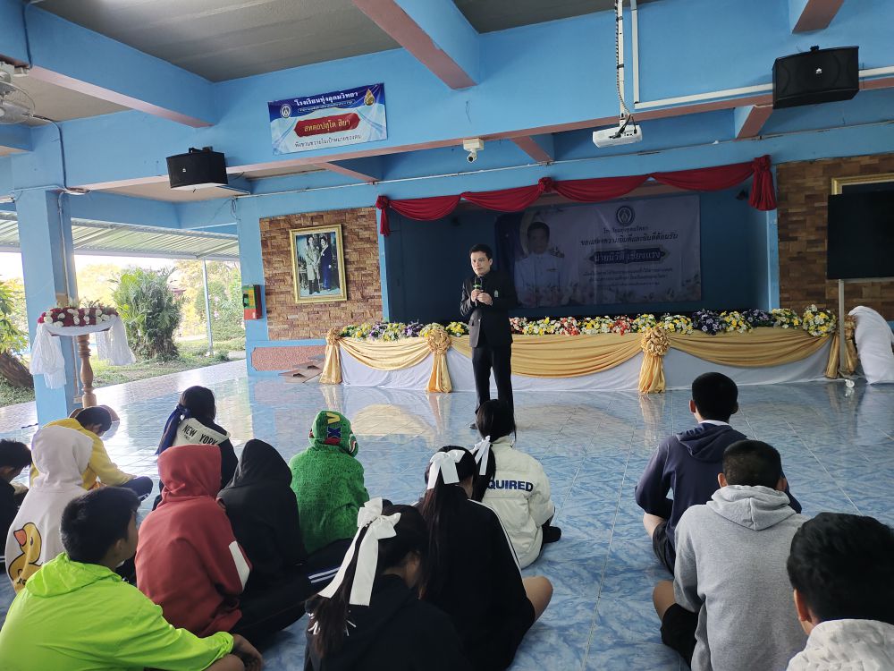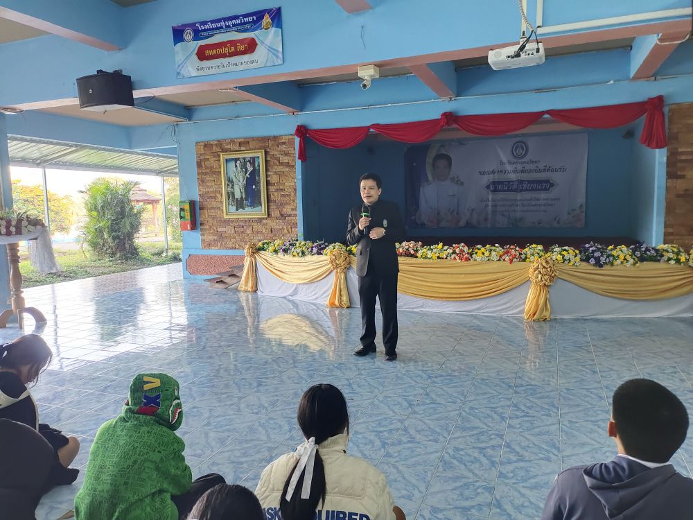 ผู้อำนวยการโรงเรียนทุ่งอุดมวิทยา ได้พบปะ พูดคุย และกล่าวให้โอวาทแก่นักเรียนหน้าเสาธง เป็นครั้งแรกภายหลังจากได้รับการบรรจุและแต่งตั้งให้ดำรงตำแหน่งผู้อำนวยการสถานศึกษา