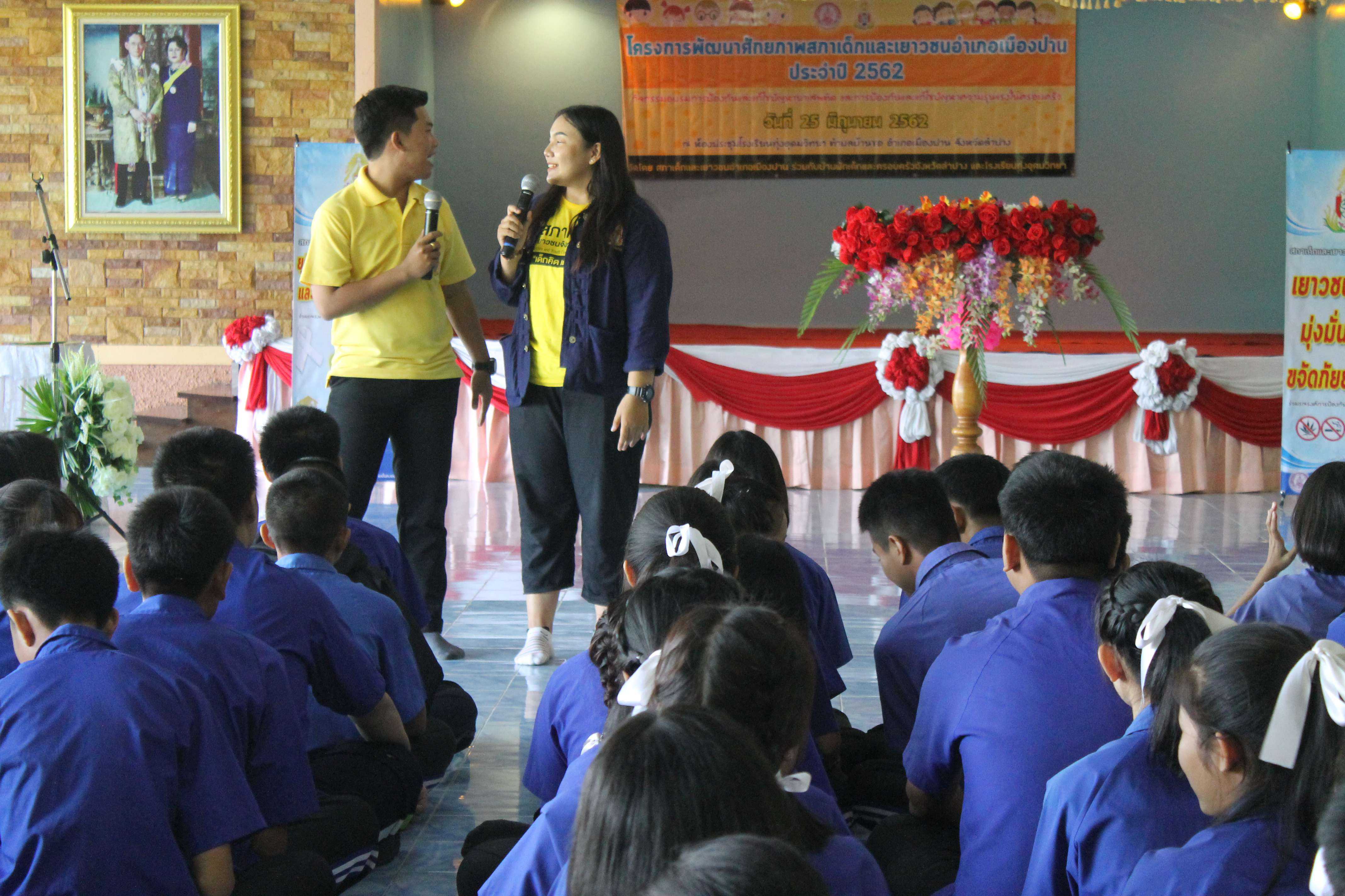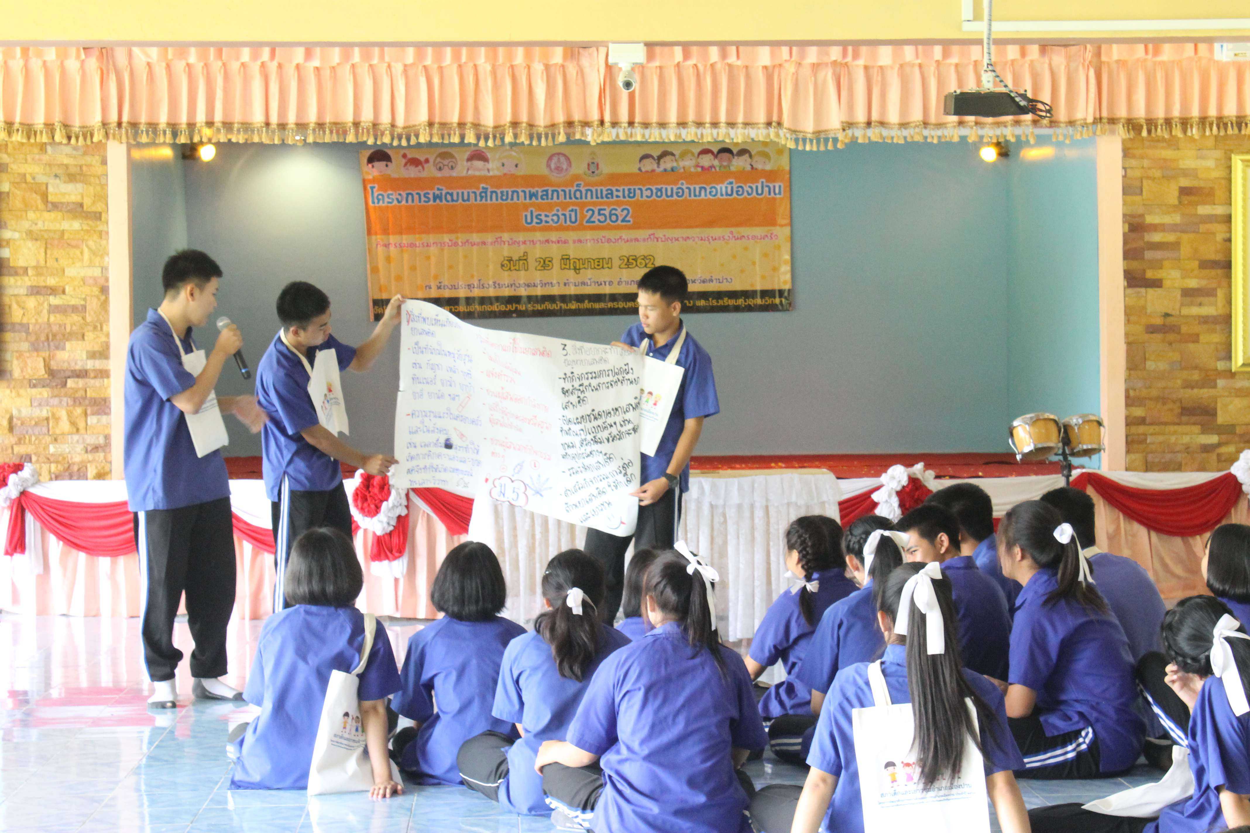 โรงเรียนทุ่งอุดมวิทยา ร่วมกับสภาเด็กและเยาวชนอำเภอเมืองปาน จังหวัดลำปาง ได้จัดกิจกรรมการให้ความรู้เรื่อง การป้องกัน แก้ไขปัญหายาเสพติดและแก้ไขปัญความรุนแรง ในครอบครัว โดยมี ว่าที่ร้อยตรี สมชาย สิริชูทรัพย์ นายอำเภอเมืองปาน เป็นประธานพิธีเปิด นายสุมล สัญญเดช ผู้อำนวยการโรงเรียนทุ่งอุดมวิทยาและคณะครูให้การต้อนรับ คณะวิทยากร จากสภาเด็กและเยาวชนจังหวัดลำปาง ที่ได้มาให้ความรู้แก่ผู้นำเยาวชนและนักเรียนจาก รร.ทุ่งอุดมวิทยา รร.ทุ่งกว๋าววิทยาคม โรงเรียนเมืองปานวิทยา เกี่ยวกับการป้องกันยาเสพติด และความรุนแรงในครอบครัว ในวันที่ ๒๖ มิถุนายน ๒๕๖๒ ณ โรงเรียนทุ่งอุดมวิทยา ตำบลบ้านขอ อำเภอเมืองปาน จังหวัดลำปาง S:1