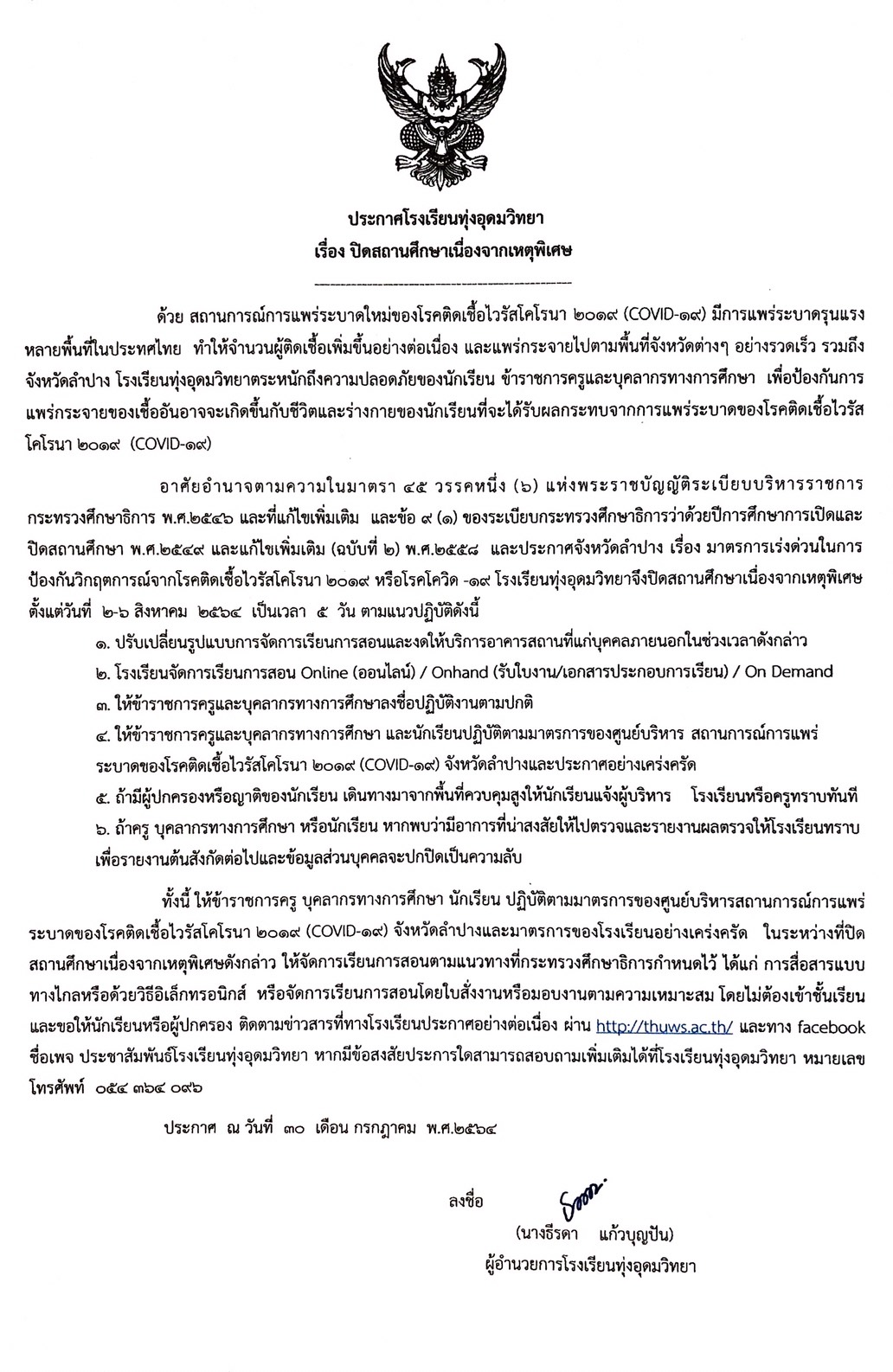 ประกาศโรงเรียนทุ่งอุดมวิทยา เรื่อง ปิดสถานศึกษาเนื่องจากเหตุพิเศษ