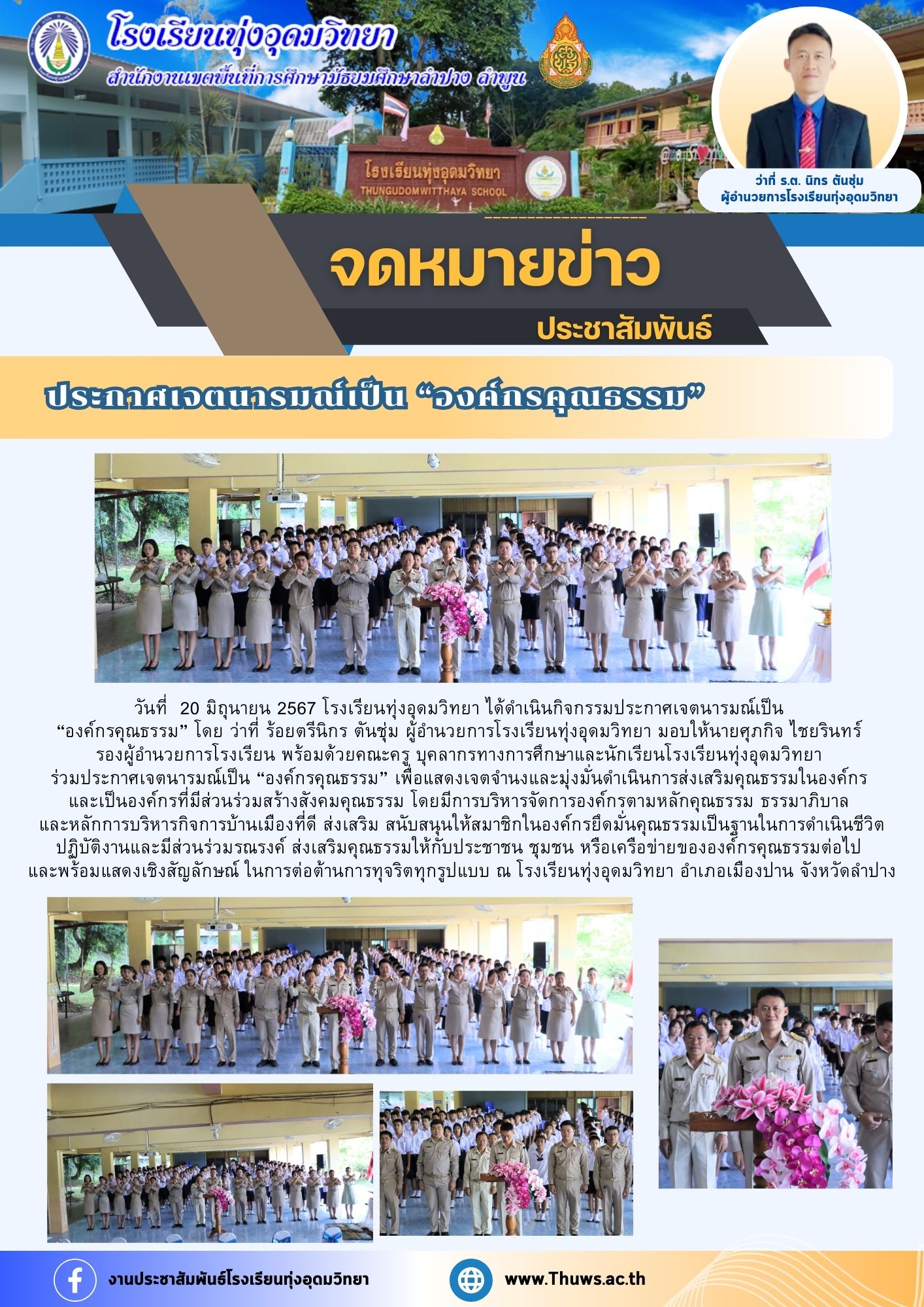 โรงเรียนทุ่งอุดมวิทยา ได้ดำเนินกิจกรรมประกาศเจตนารมณ์เป็น "องค์กรคุณธรรม"