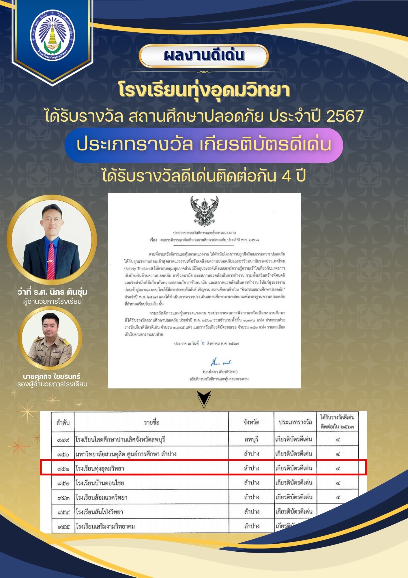 โรงเรียนทุ่งอุดมวิทยา ได้รับรางวัลเกียรติบัตรดีเด่น สถานศึกษาปลอดภัย เป็นปีที่ 4 ประจำปี 2567