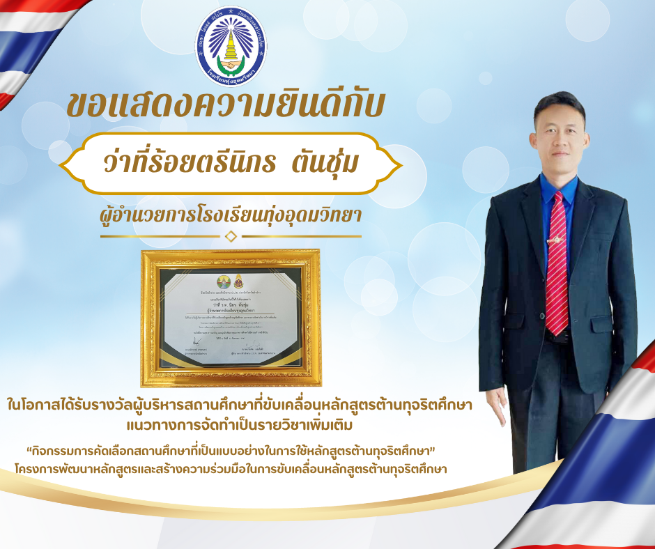 โรงเรียนทุ่งอุดมวิทยาขอแสดงความยินดีกับผู้อำนวยการโรงเรียนทุ่งอุดมวิทยา ในโอกาสได้รับรางวัลผู้บริหารสถานศึกษาที่ขับเคลื่อนหลักสูตรต้านทุจริตศึกษา แนวทางการจัดทำเป็นรายวิชาเพิ่มเติม