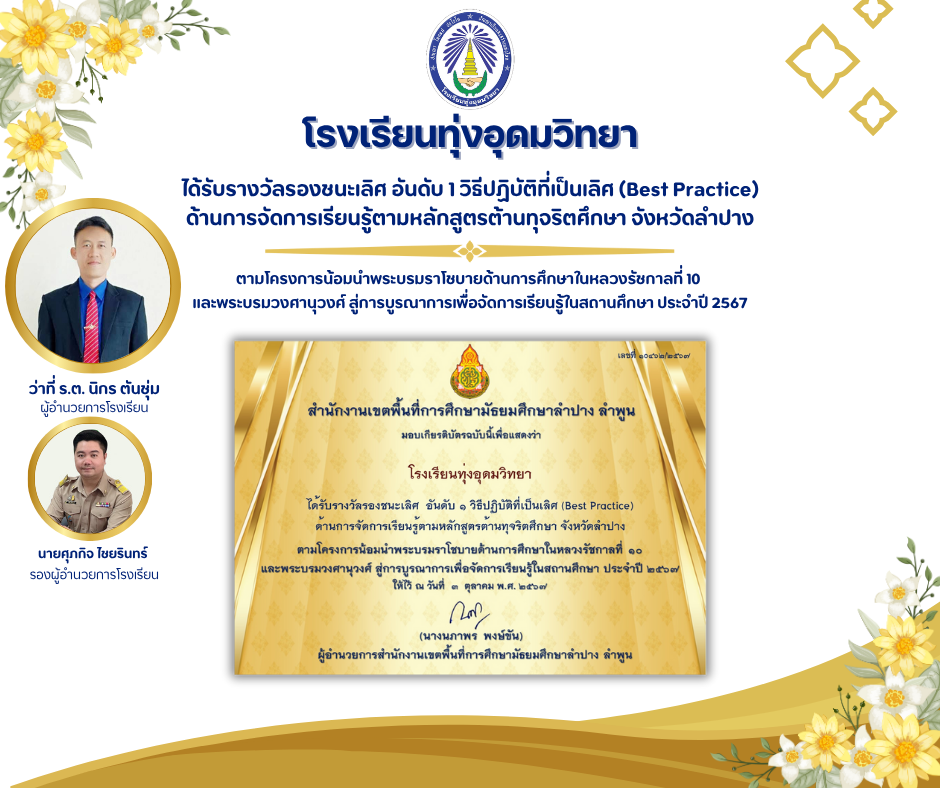 โรงเรียนทุ่งอุดมวิทยาได้รับรางวัลรองชนะเลิศ อันดับ 1 วิธีปฏิบัติที่เป็นเลิศ (Best Practice) ด้านการจัดการเรียนรู้ตามหลักสูตรต้านทุจริตศึกษา จังหวัดลำปาง