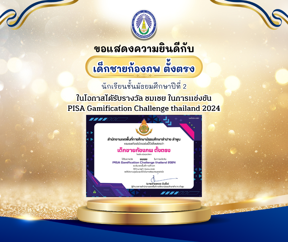 ขอแสดงความยินดีกับเด็กชายก้องภพ ตั้งตรง นักเรียนชั้นมัธยมศึกษาปีที่ 2 ในโอกาสได้รับรางวัล ชมเชย ในการแข่งขัน PISA Gamification Challenge thailand 2024
