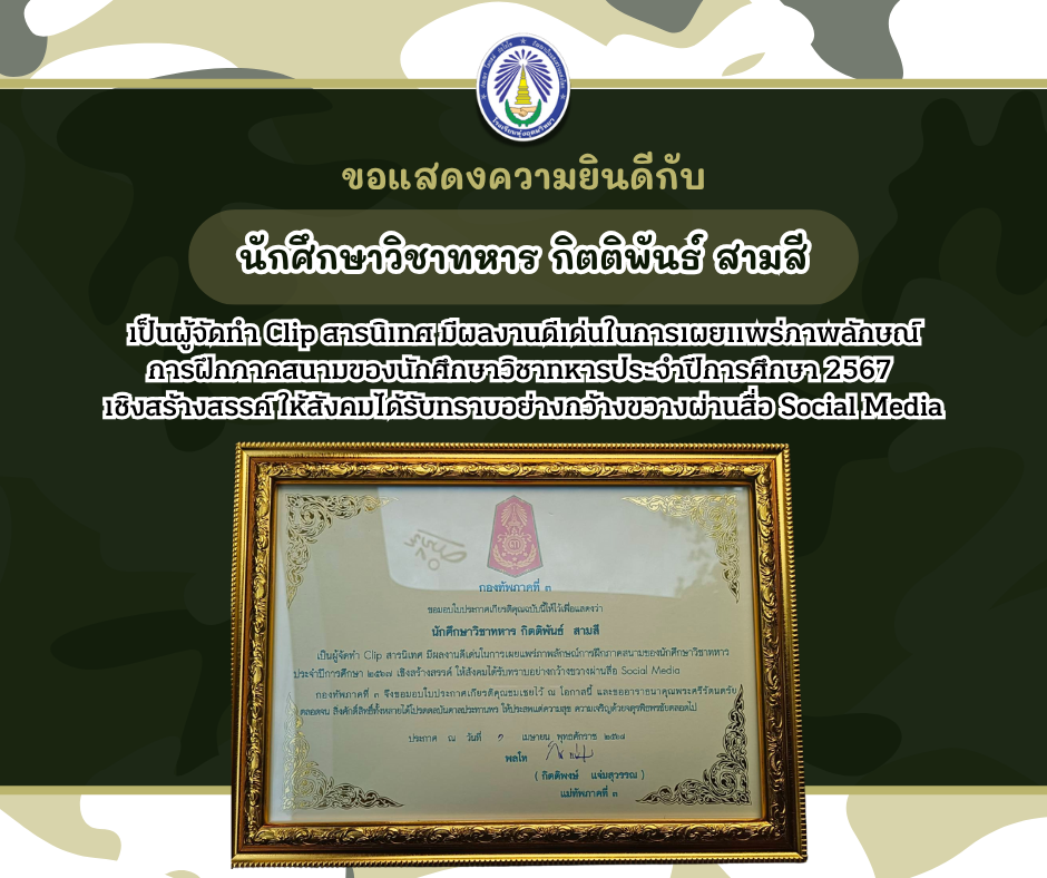 โรงเรียนทุ่งอุดมวิทยาขอแสดงความยินดีกับนักศึกษาวิชาทหาร กิตติพันธ์ สามสี เป็นผู้จัดทำ Clip สารนิเทศ มีผลงานดีเด่นในการเผยแพร่ภาพลักษณ์การฝึกภาคสนามของนักศึกษาวิชาทหารประจำปีการศึกษา 2567