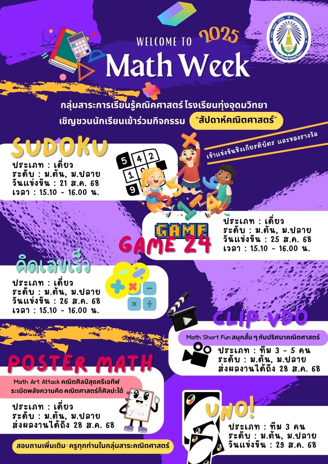 เชิญชวนนักเรียนที่สนใจ เข้าร่วมแข่งขันกิจกรรมสัปดาห์คณิตศาสตร์ เปิดรับสมัครตั้งแต่วันที่ 21 สิงหาคม 2568 จนถึงวันแข่งขัน