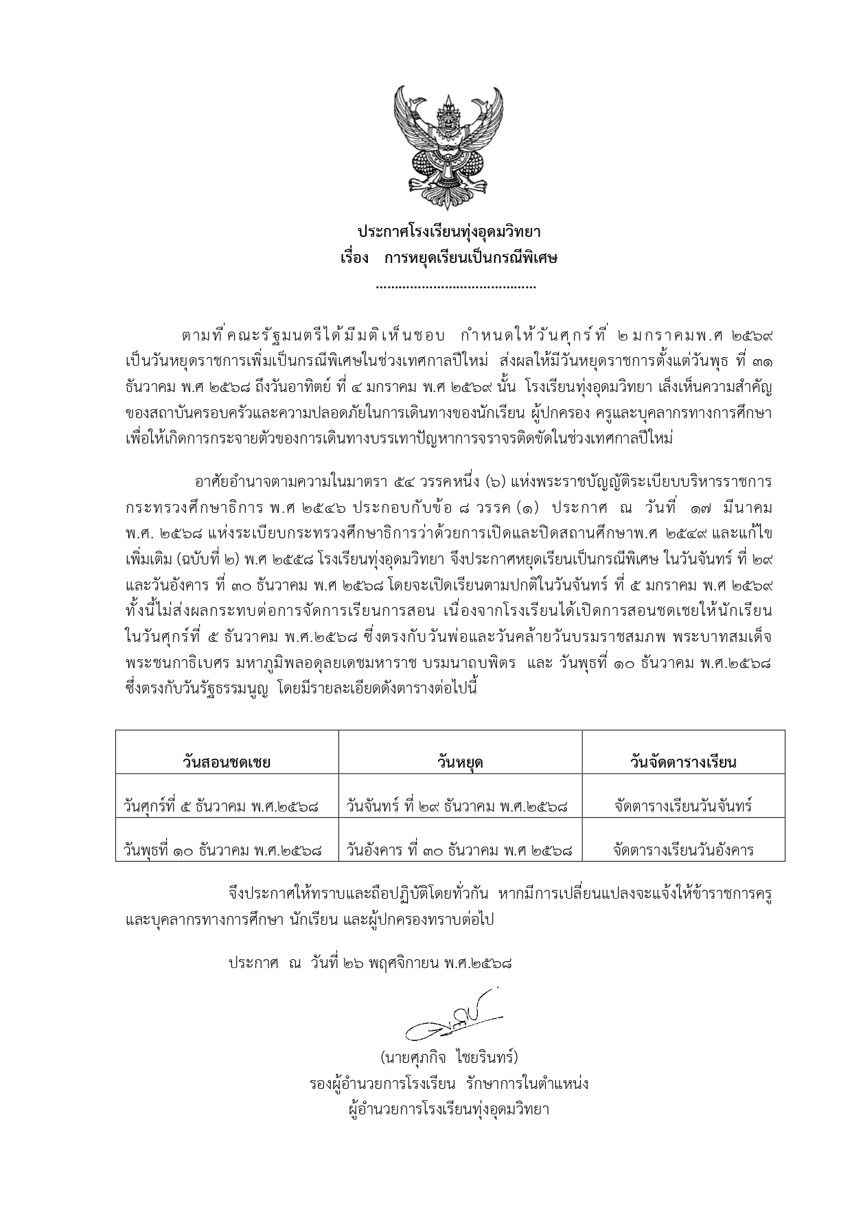 ประกาศโรงเรียนทุ่งอุดมวิทยา เรื่อง การหยุดเรียนเป็นกรณีพิเศษ