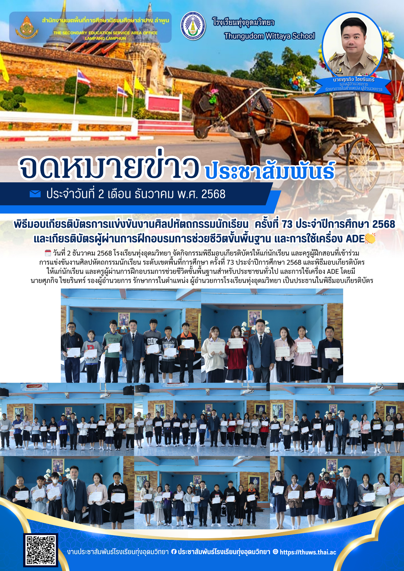 พิธีมอบเกียรติบัตรการแข่งขันงานศิลปหัตถกรรมนักเรียน ระดับเขตพื้นที่การศึกษา ครั้งที่ 73 ประจำปีการศึกษา 2568 และเกียรติบัตรผู้ผ่านการฝึกอบรมการช่วยชีวิตขั้นพื้นฐานสำหรับประชาชนทั่วไป และการใช้เครื่อง